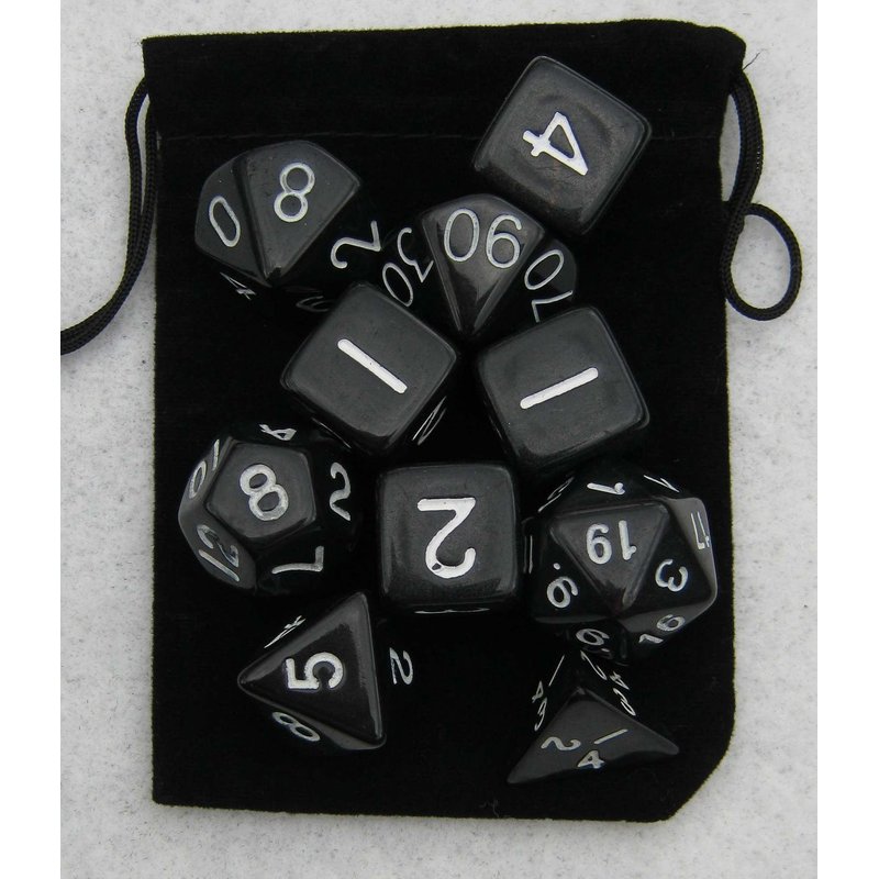 15 sets of 7 dice; 7 velvet dice bags (measuring 7x9cm) included. Colors may vary.