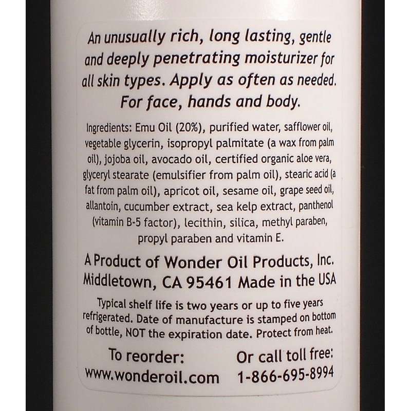 Our unique quantity of 20% Emu Oil and other ingredients combine to create a long lasting lotion with a smooth silky feel typical of lotions costing much more. All ingredients are chosen specifically for their low potential to cause irritation. Unscented, with NO mineral oil. Contains 20% Pure Emu Oil.