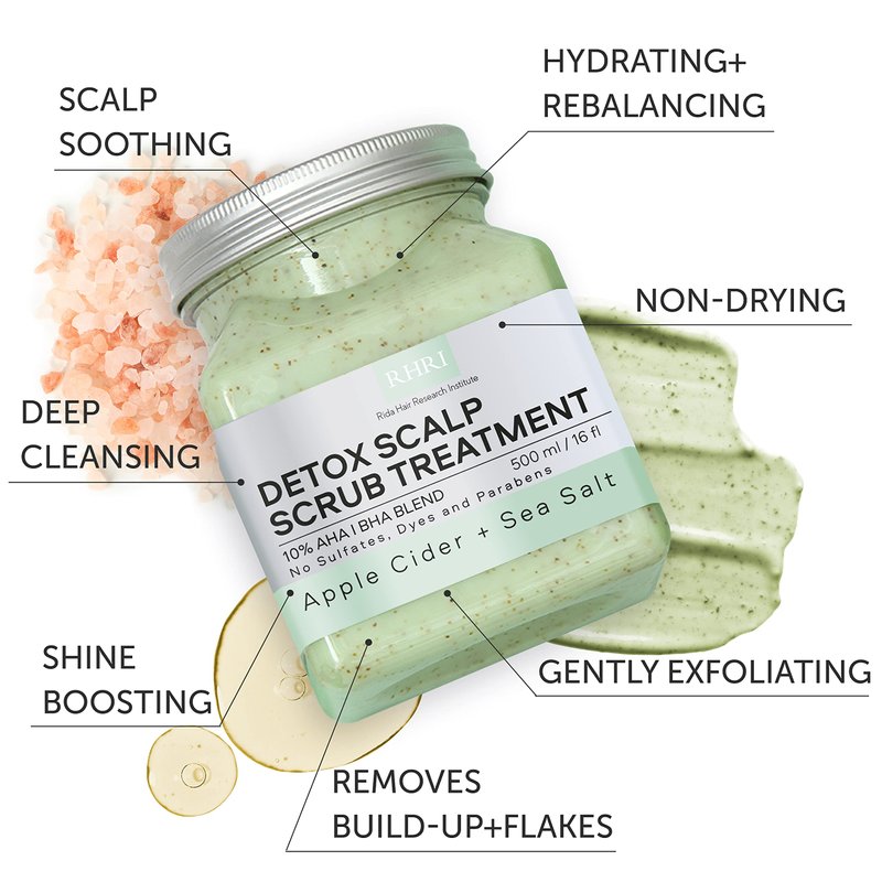 - Deep Cleansing Formula: RHRI Green Scalp Scrub with apple cider & sea salt detoxifies, and removes build-up & excess oil for a revitalized and balanced scalp. Experience the ultimate hair refresh.