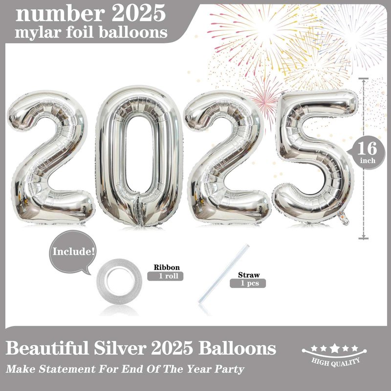 - WHAT YOU WILL RECEIVE: You will receive a set of 16-inch Silver 2025 Number Balloons (uninflated), along with a 33-foot roll of ribbon and one straw. These 2025 number balloons are designed to fulfill your balloons needs for a New Year-themed party.