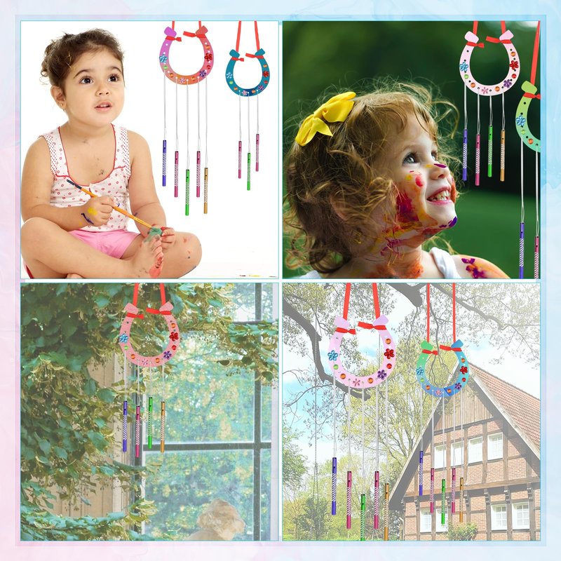 - Package Content: You will receive a DIY wooden wind chime kit for kids, including 8-hole horseshoes and 3-hole horseshoes, a total of 16 pieces of wooden horseshoes in 2 designs (8 pieces for each design); 48 pieces of wind chime pipes (4 colors, 12 per color), 2 pieces of painting brushes, 12 colors paints, 16 pieces of 1M silver wires, 16 pieces of colorful ropes, and 1 sheet of rhinestone sticker. The quantity is sufficient to meet your child's usage needs.