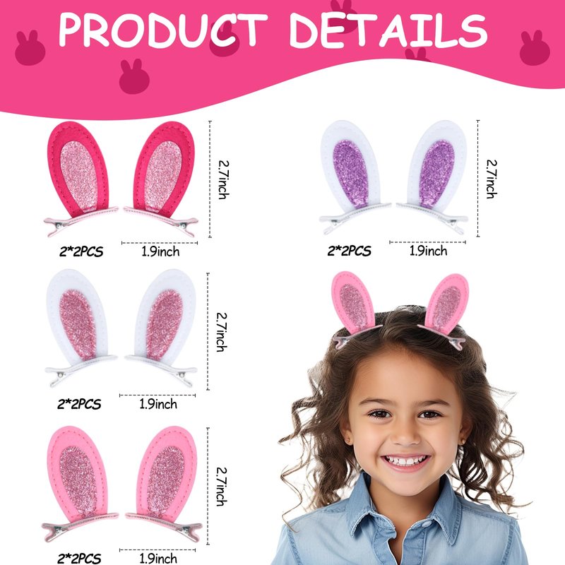 - 【BUNNY EARS CLIPS】You will get 8 pairs of bunny hair clips for girls. There are four different colors. 8 pairs of sparkly hair clips will satisfy your matching as well as sharing with friends and family. The design of hair clips for baby bunny ears looks more cute. We added sequins to the front part of the bunny ears headband, which will make rabbit ear clips the look sparkly. This costume small bunny ears hair clips for girls. Making the girl's dress vivid and lovely.