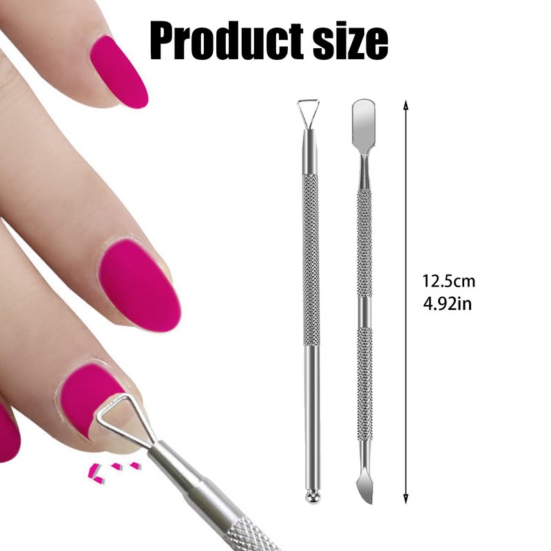 The triangular head is designed to work not only on large surfaces to remove dead skin quickly, but also in small corners without missing any tiny crevices. The other one has a spoon shape on one side and a blunt blade on the other side for removing nail polish residue on the surface of the nails, it can remove cuticles easily, it can also be used to clean the inside of the nails, you can choose to use it as needed.