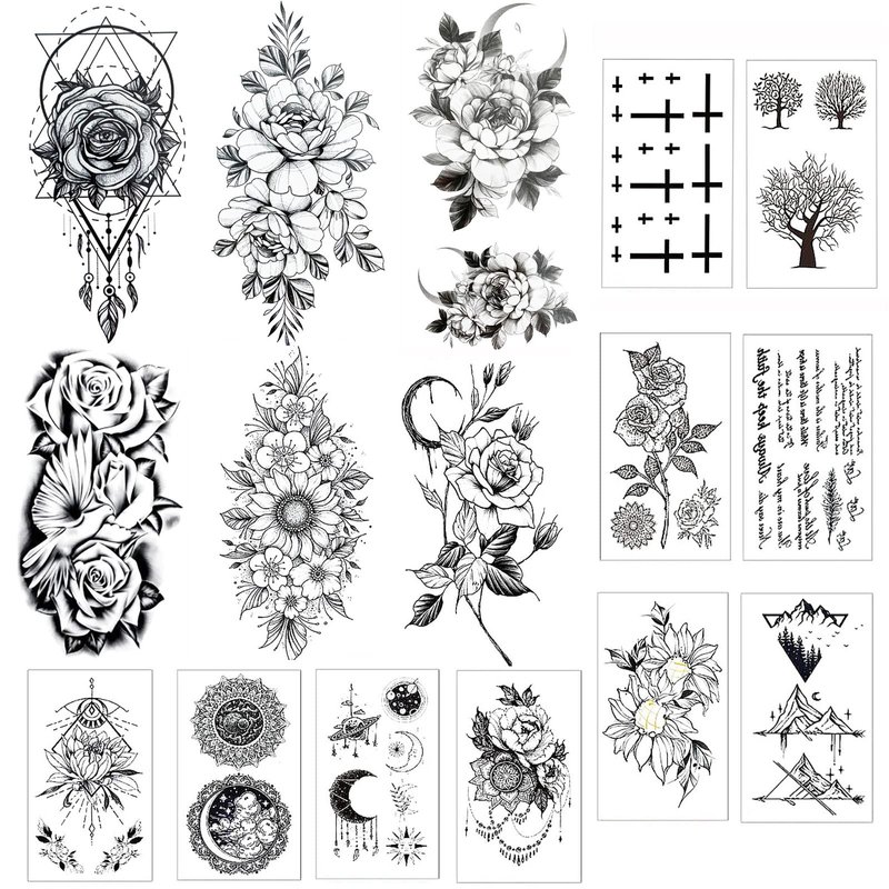 16 Sheets 3D Black Flower Temporary Tattoos for Women Body Arm Neck Waterproof Fake Tattoos Rose Sunflower Moon Tattoo Stickers for Adults Girl