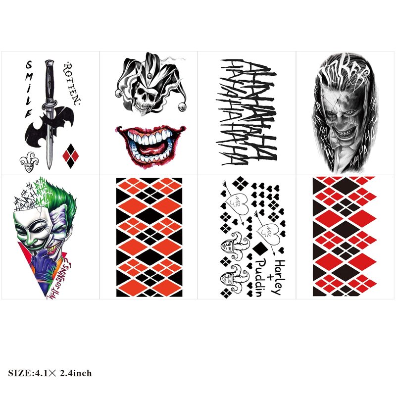 - MORE QUANTITY - 16 sheets Joker tattoos for Suicide Squad. 8 sheets large size Joker tattoos (size 8.3x5.9 inch), and 8 sheets Harley Quinn tattoos (size 4.1x2.4 inch). More quantity tattoos for Suicide Squad are enough for you share it with your family and friends