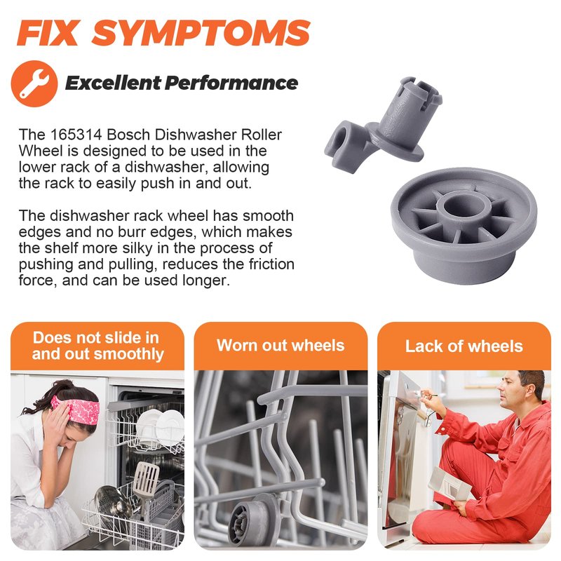 - 【8 PACK 165314 DISHWASHER LOWER RACK WHEEL】: The 165314 Dishwasher Wheel Lower Rack is designed to be used in the lower rack of a dishwasher, allowing the rack to easily push in and out of your appliance. Each 165314 Bosch Dishwasher Basket Wheel has an additional locking clip. The dishwasher lower rack wheel 165314 attaches directly to the rack, you simply snap it onto the rack frame. Includes 8 x 165314 Dishwasher Lower Rack Wheel. Size: 1.4 x 1.4 x 1.0 inches. ➤The 165314 dishwasher roller wheel CAN FIXS THE FOLLOWING CONDITIONS, REPLACE the 165314 dishwasher lower rack wheels in time: Dishwasher rack does not slide in and out smoothly. Dishwasher rack missing wheels. Worn out wheels.