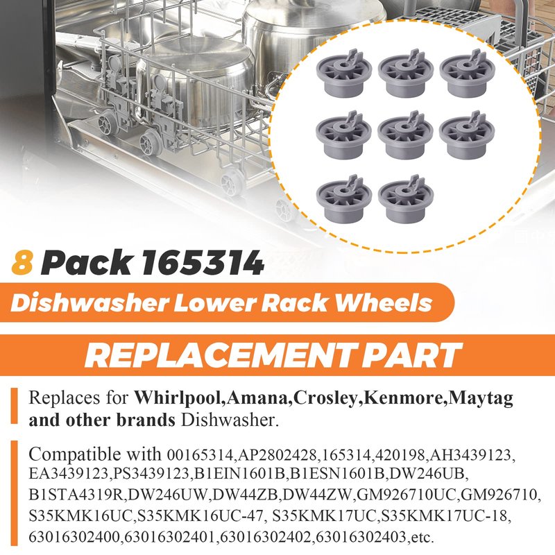 - 【LIFETIME WARRANTY】: 165314 Dishwasher Lower Rack Wheels 𝐒𝐔𝐏𝐏𝐎𝐑𝐓 𝐋𝐈𝐅𝐄𝐓𝐈𝐌𝐄 𝐑𝐄𝐓𝐔𝐑𝐍 𝐎𝐑 𝐄𝐗𝐂𝐇𝐀𝐍𝐆𝐄. If for any reason you are not satisfied with the 165314 Dishwasher Lower Rack Wheels during the warranty period, you may request a replacement or a full refund. If you have any questions at the time of purchase or after purchase, you can contact us. Please check the model number before ordering. If you are not sure if the 165314 Dishwasher Wheel will fit, you can send us the dishwasher model number and we can confirm it for you.