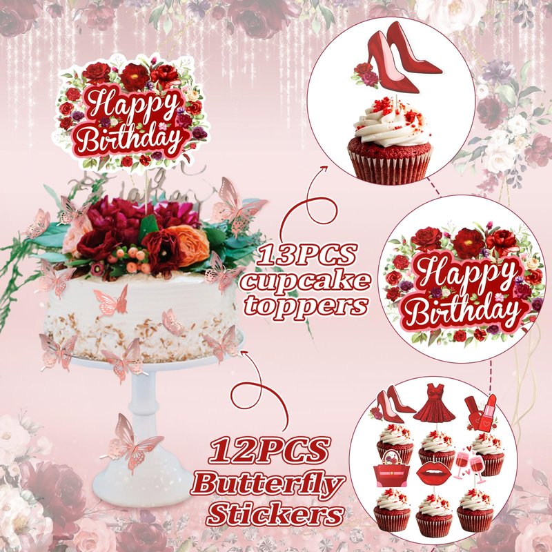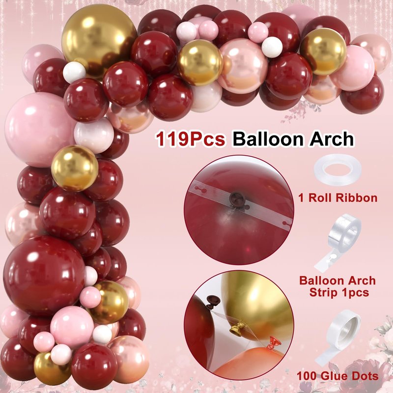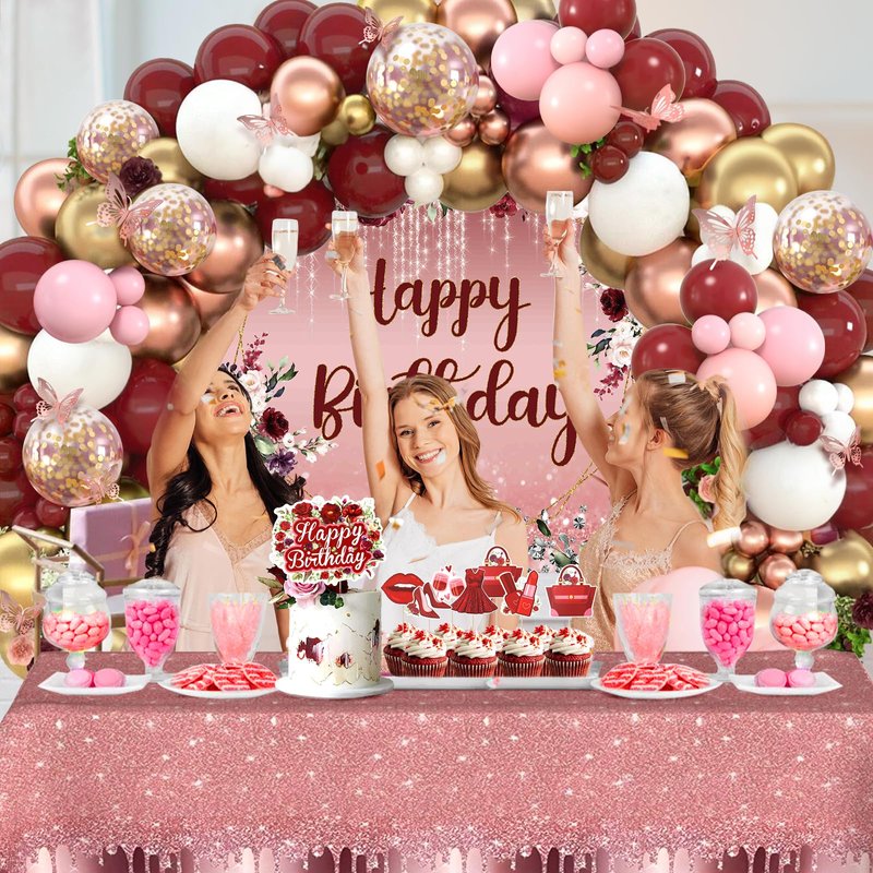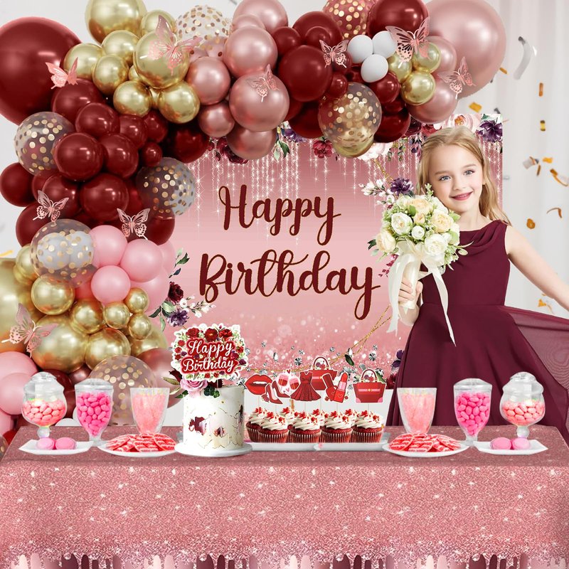 - Elegant Burgundy Balloon Decor: Planning a sophisticated event with a burgundy theme? Our maroon birthday party supplies set is an exquisite choice. It comes with 123 latex balloons, happy birthday backdrop, 59 x 39 inches, tablecloth, cupcake toppers, 12 butterfly sticker.Effortlessly set the stage for a romantic and enchanting celebration with our burgundy, rose gold, and pink balloons, making it a birthday party to remember
