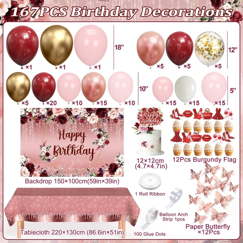 167Pcs Happy Birthday Decorations for Women Girls Burgundy Balloon Arch Kit with Maroon Rose Gold Balloons Backdrop Tablecloth Cupcake Toppers Butterfly Sticker Floral Burgundy Birthday Party Supplies