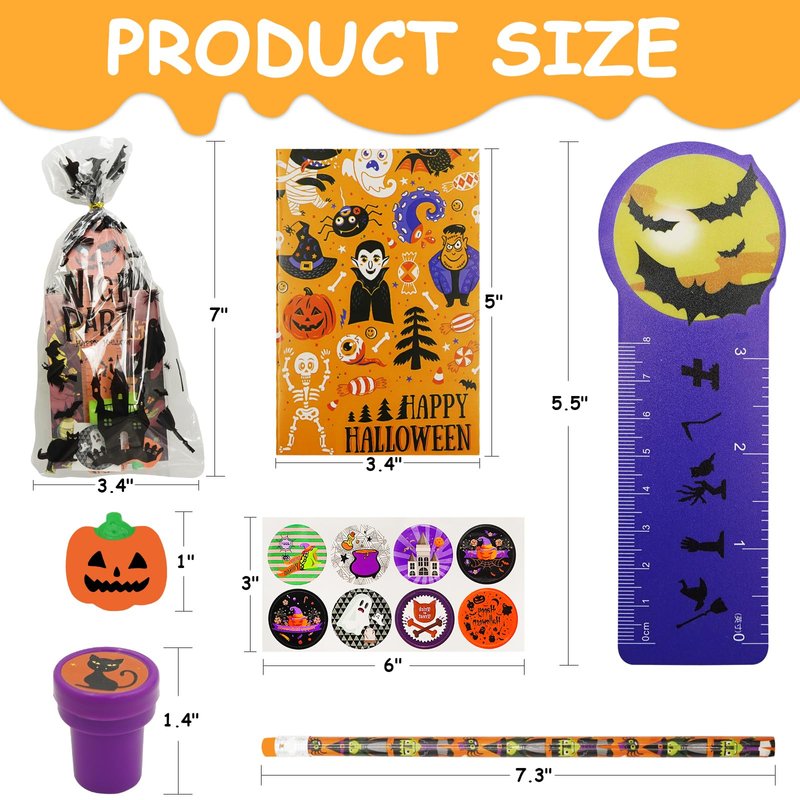 - 🎃【Super Value Halloween Party Favors】24 Pack Halloween Stationery Gift Set totaling 168 fun pieces 24 Halloween rulers, 24 Halloween notebooks, 24 Halloween pencils, 24 Halloween erasers, 24 Halloween stamps, 24 Halloween stickers and 24 Halloween goodie bags,ect. Enough quantity meet kids to adding an extra layer of surprise to your festivities.