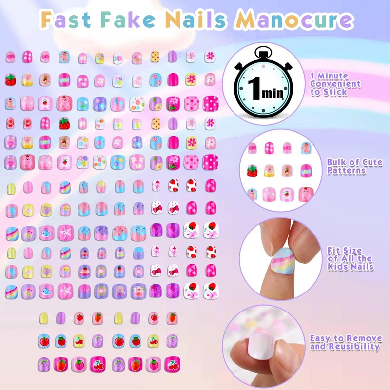 Shynek 168 pieces 7 Pack Press on Nails for Kids made with premium plastic material, adopt with pre glue style, easy for kids to stick on fingernails. With 12 different sizes, including most kids' fingernails size. Children's fake short nails with rich patterns designs and bright colors are great gifts for girls on Christmas, New Year’s Day, Valentine's Day gifts, and birthday gifts. Product Information: