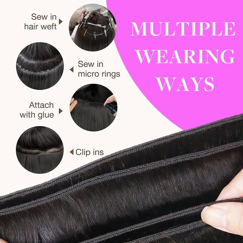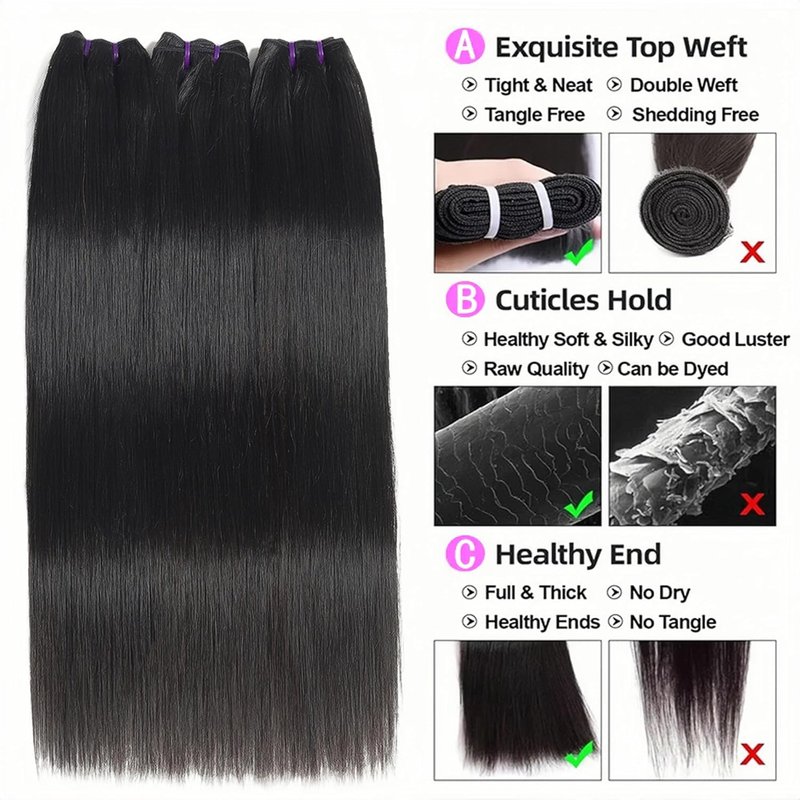- Straight Bundles Human Hair Texture:16A Straight Human Hair Bundles,Quick Weave Hair Bundles,Double Strong Machine Weft, High Elasticity & Bouncy, Tight & Neat, None-chemical Processed,No Lices,Soft & Shiny, Soft Hair Ends.Longer Service Life, Usually Lasts 8-24 months with Careful Care.