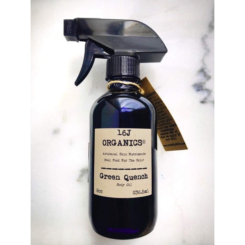 - Green Quench 8oz - Body oil a green juice - smoothie of life-sustaining oils and essential oils from fruits, nuts, seeds, herbs, roots and flowers that provides the skin vital collagen building nourishment from the outside in and makes your skin glow, soft and completely moisturized. It can be used on the face and beards as well.Use: Spray a nickel size amount into your hands and rub on clean wet skin