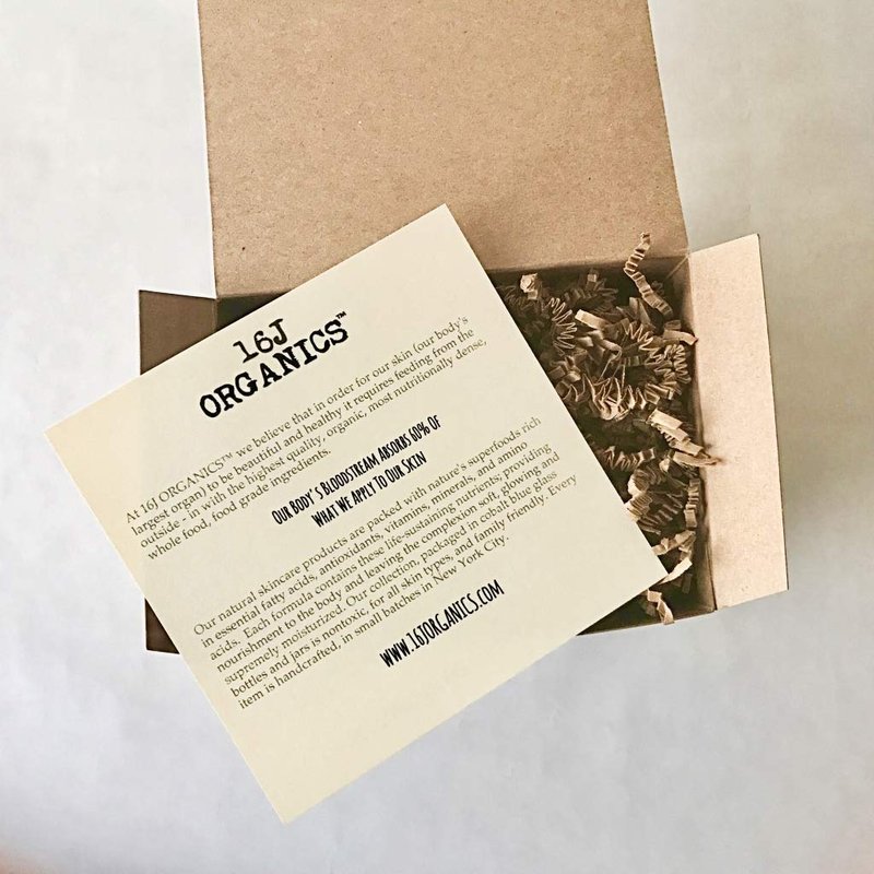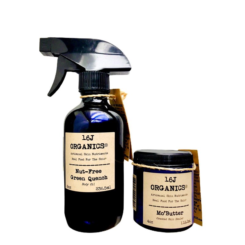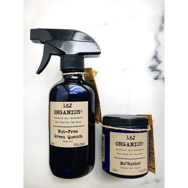 16J Organics Handcrafted Skin Care Nut-Free Moisturizing & Nourishing Spa Gift Box Includes Two of 16J Organics’ Signature Handcrafted Products "Nut-Free Green Quench" and "Mo'Butter"-100% Natural, Organic, Raw, Nutritionally Dense Food Grade Ingredients. Made in small batches & packaged in nontoxic reusable cobalt blue glass.