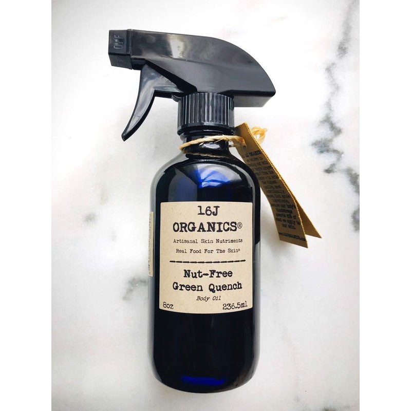 - Nut-Free Green Quench 8oz - Body oil a green juice - smoothie of life-sustaining oils and essential oils from fruits, seeds, herbs, roots and flowers that provides the skin vital collagen building nourishment from the outside in and makes your skin glow, soft and completely moisturized. It can be used on the face and beards as well. How to use: Spray a nickel size amount into your hands and rub on clean wet skin