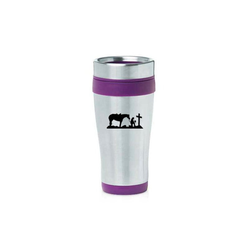 16oz Insulated Stainless Steel Travel Mug Cowgirl Praying Cross Horse (Purple)