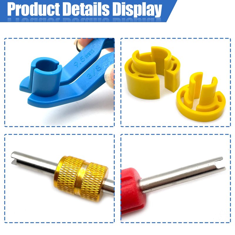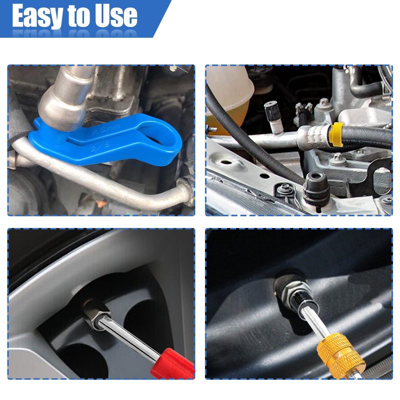 3.A great assortment of tools for sure: AC Fuel Line Disconnect Tool Set, Line Quick-Connect Release Tool, Yellow Dual Head Valve Core Remover, Red Dual Head Valve Core Remover.