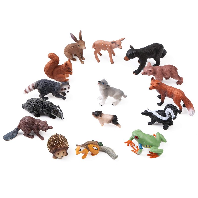 - 16pcs forest toy figurines: Bear Cub, Raccoon, Newborn piglet, Rabbit, Red Fox, Badger, Black bear cub, Squirrel, Chipmunk, Skunk, Gray wolf baby, Tree Frog, Hedgehog baby, Deer fawn, Beaver and Owlet.