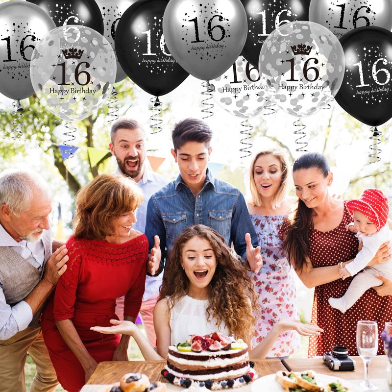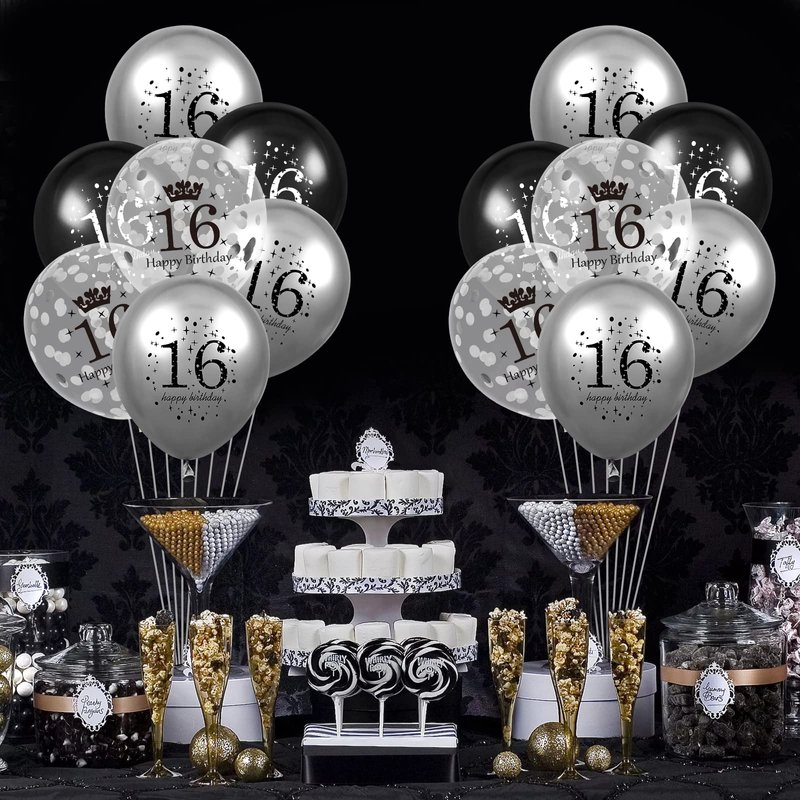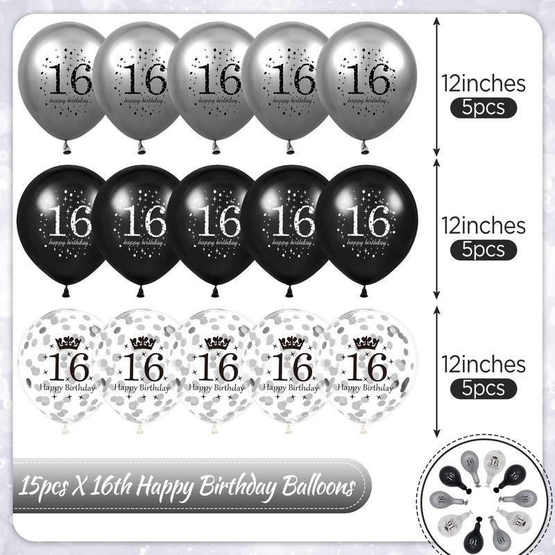 - 🍰INTERESTING DESIGN ON HAPPY BIRTHDAY BALLOONS:These 16th black and silver birthday party balloons are the ultimate party accessory! Showcasing a stylish design with the numbers "16" and "happy birthday" printed upon them, these balloons add festive atmosphere that is impossible to miss.