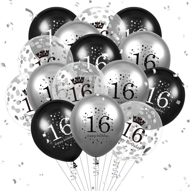 - 🍰HAPPY BIRTHDAY BALLOONS DECORATIONS:Add a pop of color to someone’s 16th birthday celebration with our vibrant party balloons. Available in several color options, there are 15pcs colorful print balloons (5 black birthday balloons,5 Silver birthday balloons,5 birthday balloons with clear silver sequins)you're sure to find the perfect match for your party decor.