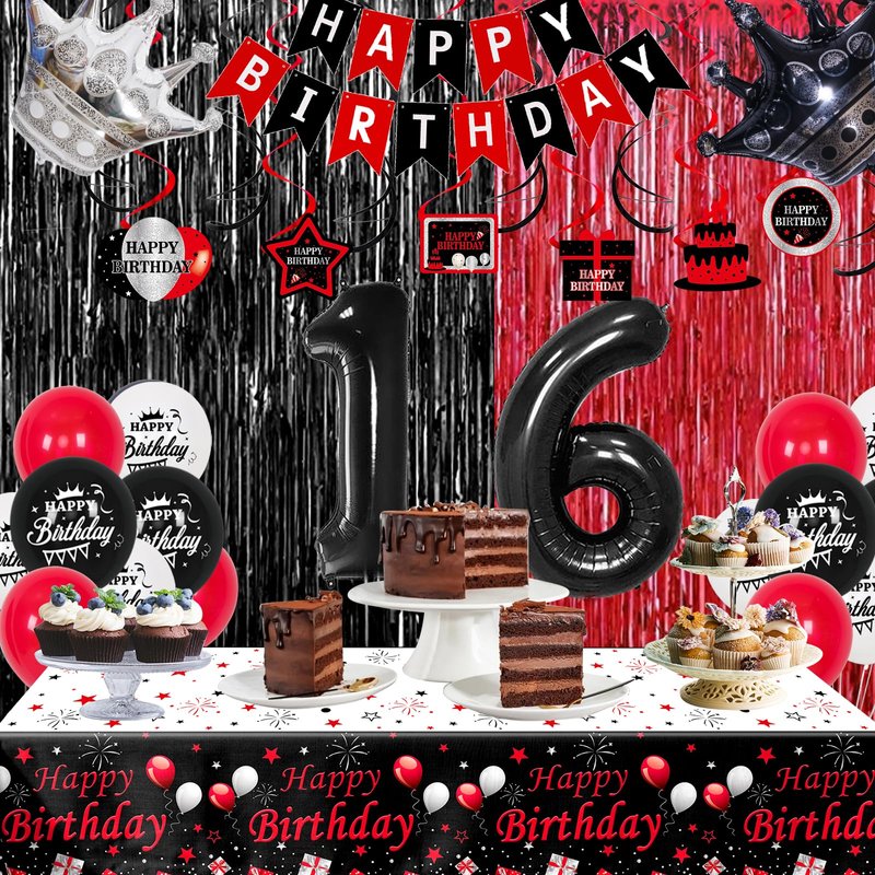 - 【Great Value Pack 16th Birthday Decorations for Boys and Girls】16th birthday decorations including 1 x red black HAPPY BIRTHDAY banner, 8 x 10 red latex balloons, 8 x 12 black HAPPY BIRTHDAY balloons, 4 x 12 white HAPPY BIRTHDAY balloons, 4 x 10 star foil balloons(2 red+2 black), 2 x crown foil balloons(red+black), 2 x 32 number "16" foil balloons, 6 x black hanging swirls, 6 x red hanging swirls, 6 x happy birthday pendants, 1 x tablecloth(70.86*42.51in), 2 x foil fringe curtains.