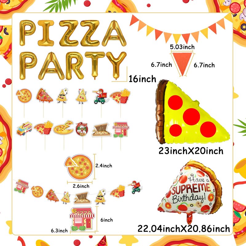 - You will get: 1 x Pizza Party Balloon, 1 x banner, 2 x pizza balloon, 12 x pizza cupcake picks, 1 x pizza banner
