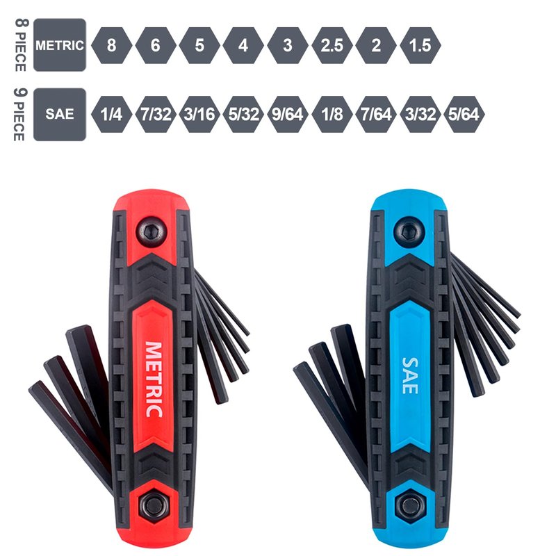 - ▲ MOST POPULAR SIZE COVERAGE - Includes 17 most commonly used inch and metric sizes from small to large: Standard SAE 5/64, 3/32, 7/64, 1/8, 9/64, 5/32, 3/16, 7/32, 1/4” and Metric 1.5, 2, 2.5, 3, 4, 5, 6, 8mm