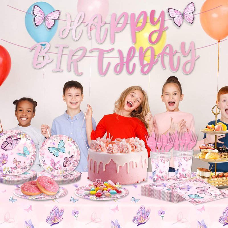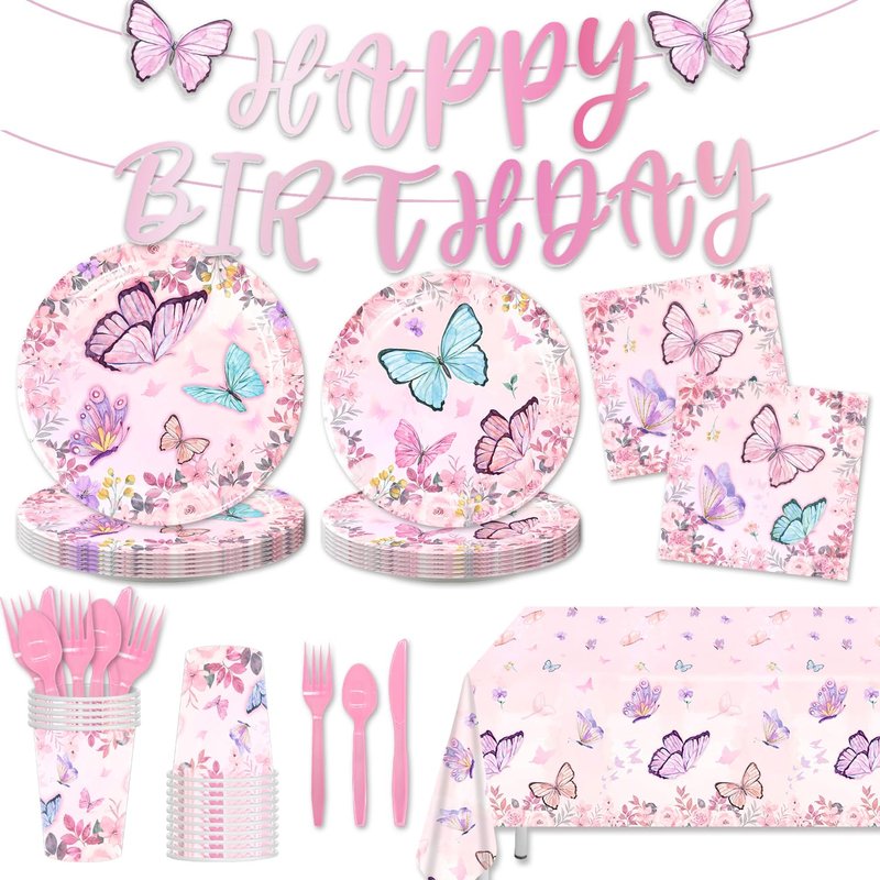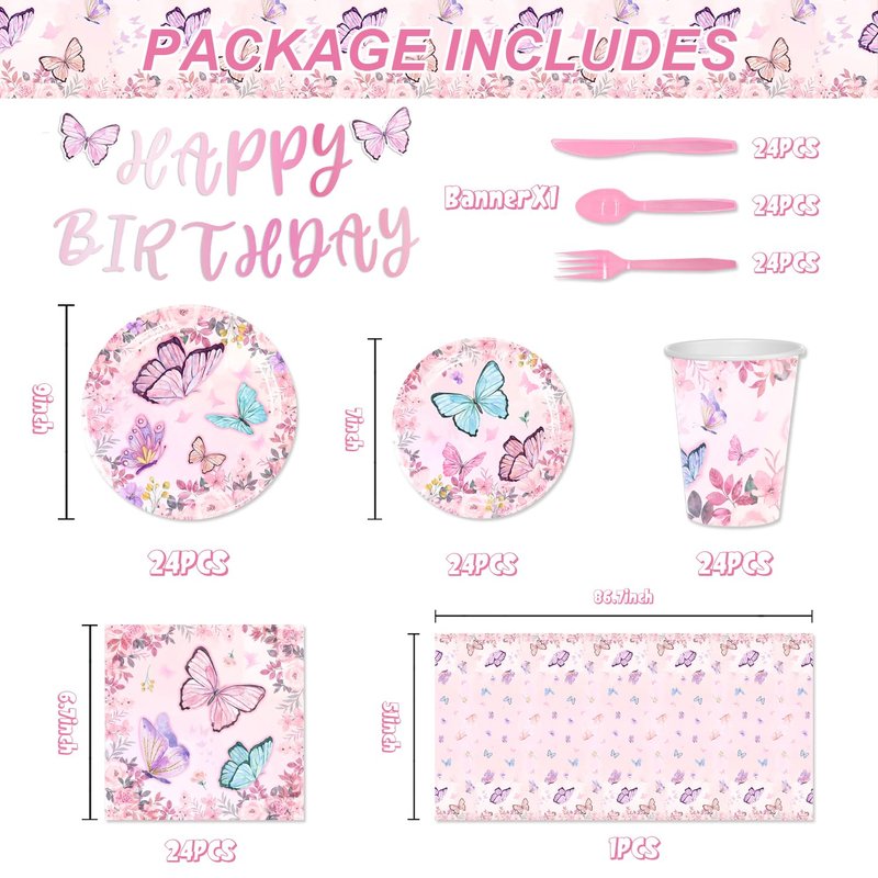 - Butterfly decorations PACKAGE INCLUDING: 24*dinner paper plates (9 inches), 24*dessert paper plates (7inches), 24*napkins, 24*paper cups (9oz), 1*Happy Birthday banner, 1*tablecloth (51*87inches)
