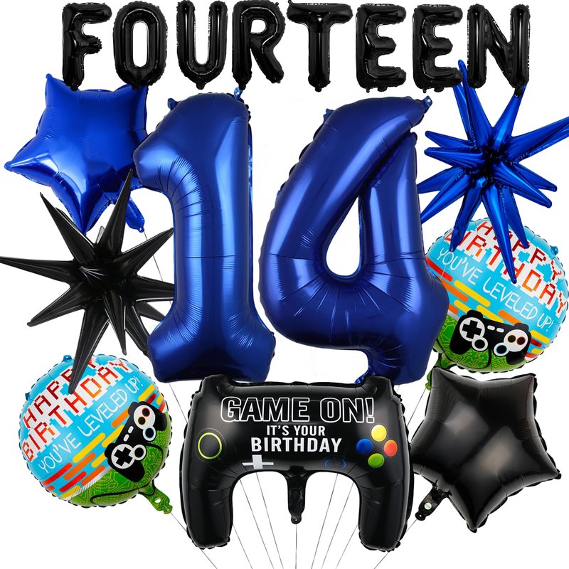 17pcs Video Game Themed Party Decorations, Number 14th Boys Birthday Party Supplies, Navy Blue Video Game Controller Mylar Foil Balloon, Video Game Party Decoration Supplies
