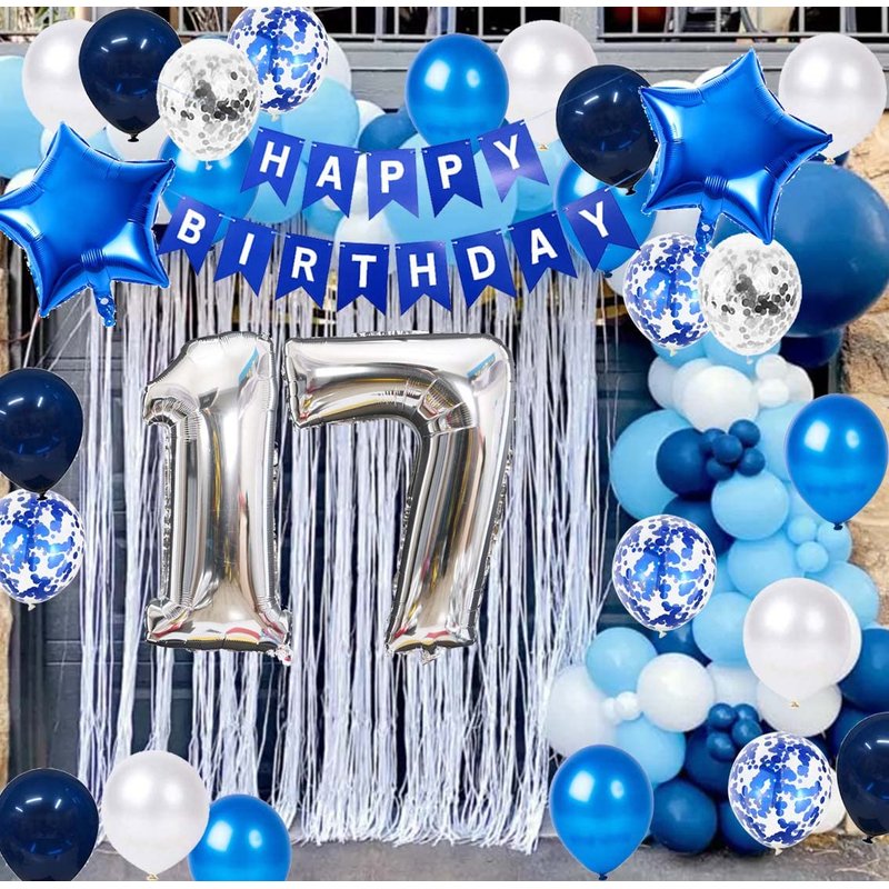 - 17th Birthday Decorations Blue Sets Include: 1 * blue 'HAPPY BIRTHDAY' Letter Banner, 1* number 17 balloons, 2* star foil balloons, 25 latex party balloons in 5 styles(5* blue color, 5* white confetti, 5* white, 5* navy blue, 5* blue confetti), 1* 10m ribbon. Total 31packs in one package.
