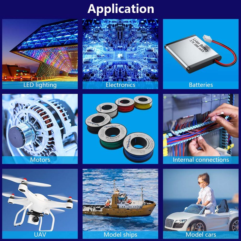 - Application-Fermerry silicone wires are widely used in LED lighting, electrical and electrical equipment, aluminum batteries, RC batteries, model wiringz harnesses, instrumentation internal connections, large transformers and motors connecting equipment with wires,etc.