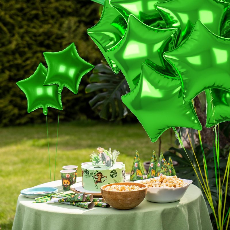 - Material: Our green star balloons are made of advanced material aluminum foil, which is non-toxic and harmless. Air or helium can be injected into the balloon, which can inflate the balloon well, and the advanced material that it will not burst easily, suitable for party decoration.