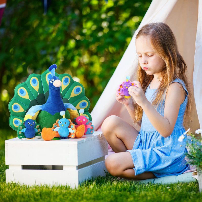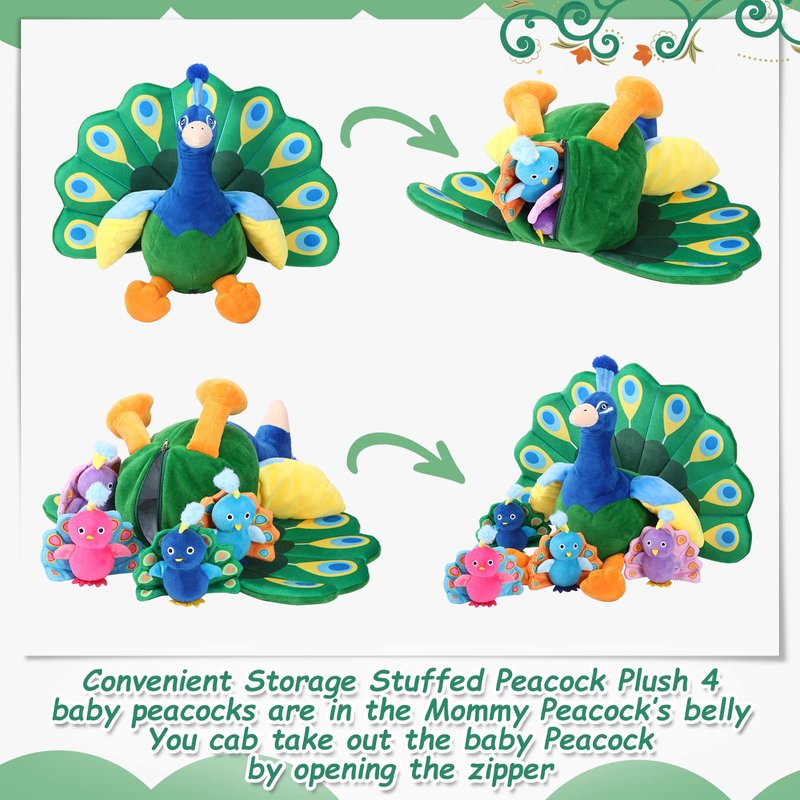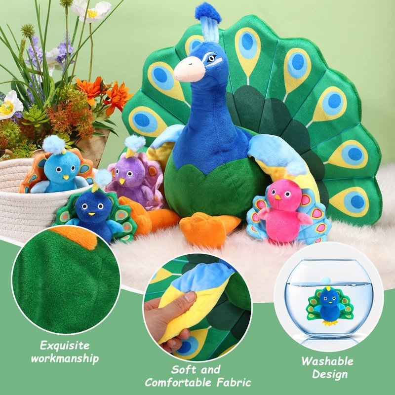 There is a zipper design on the back of the big peacock toy, which can accommodate 4 small peacocks when the zipper is open, which increases the playability and can exercise your hands on ability and imagination.