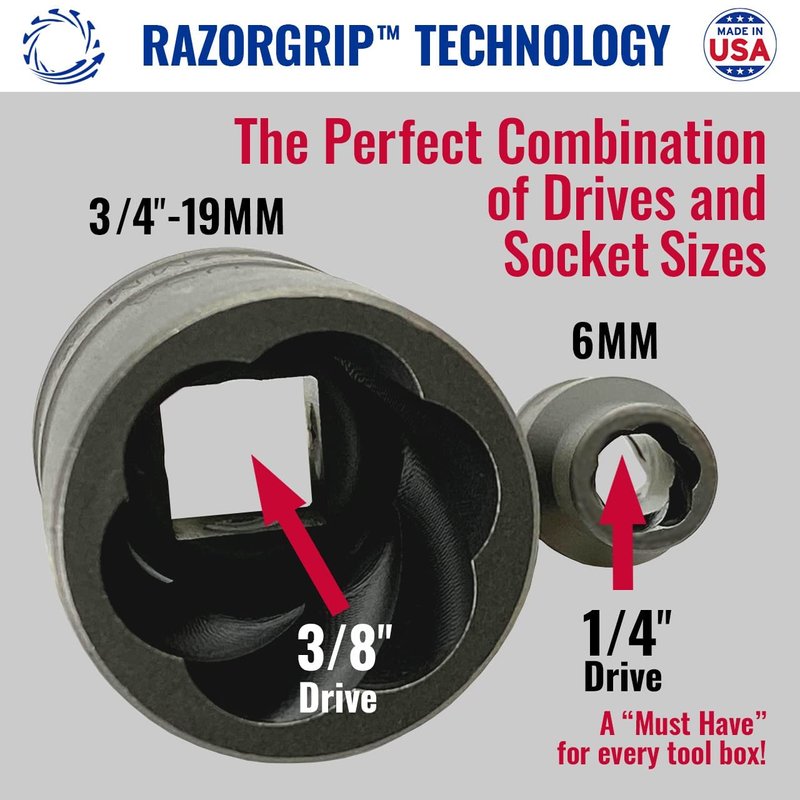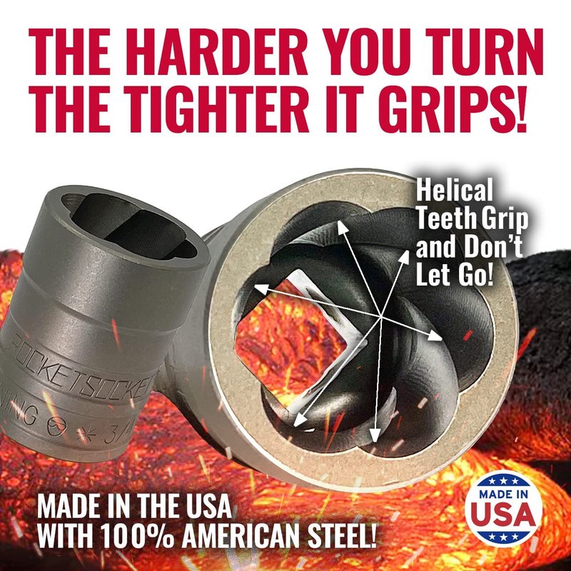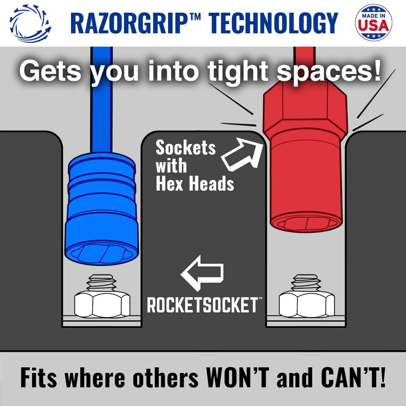 Rocketsocket is the original and best damaged fastener removal socket. Designed, engineered and manufactured in the USA with American Drawn Steel. Rocketsocket features RAZORGRIP Extraction Technology with helical teeth that grip and don't let go to easily and quickly remove frozen, rusted, stripped, or rounded-off nuts, bolts and screws.