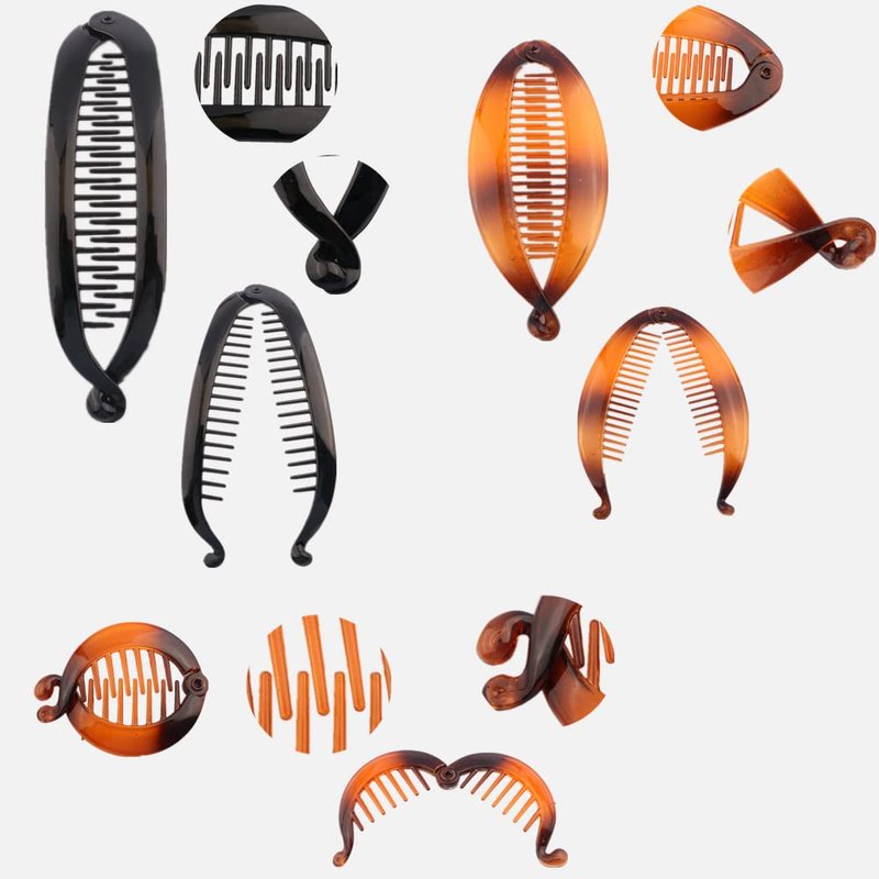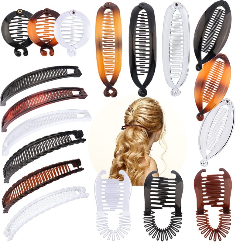 - [Package include] You will receive a package including 6 styles banana hair clips.There are 3 double comb clips,3 fishtail ponytail clips,3 pointed fish clips,3 large round comb clips,3 plastic double side comb banana hair clips,3 Flexible interlocking banana clips. These can fully meet your daily needs.