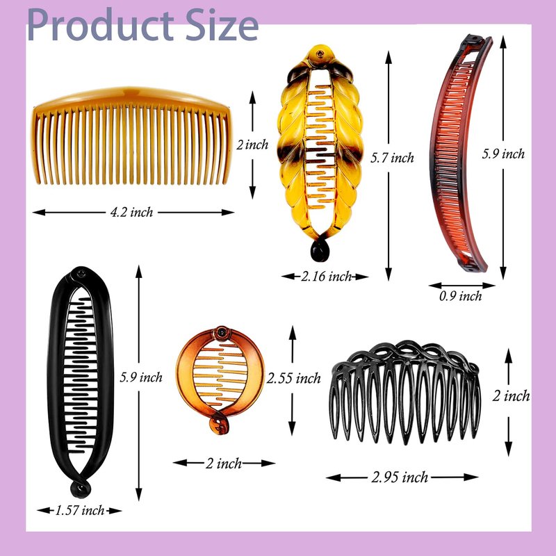 - [Variety of styles] You will receice a package including 6 styles banana hair clips in 3 different color. There are 3 pieces plastic double side banana clips, 3 pieces fishtail ponytail holder combs, 3 pieces pointed fish clip, 3 pieces large round comb clips,3 pcs 11 teeth plastic hair combs and 3 pcs 29 teeth plastic hair combs. These can fully meet your daily needs.