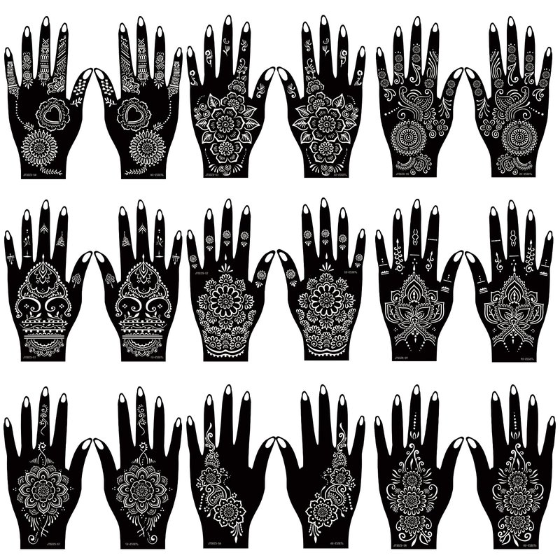- 18 Sheets with high-quality 3 layers PVC henna hand stencils; Safe,Washable and Non-Toxic.Beautiful, Stylish, Easy to Use, Size: 21cm x 12cm/8.2" x 4.7"