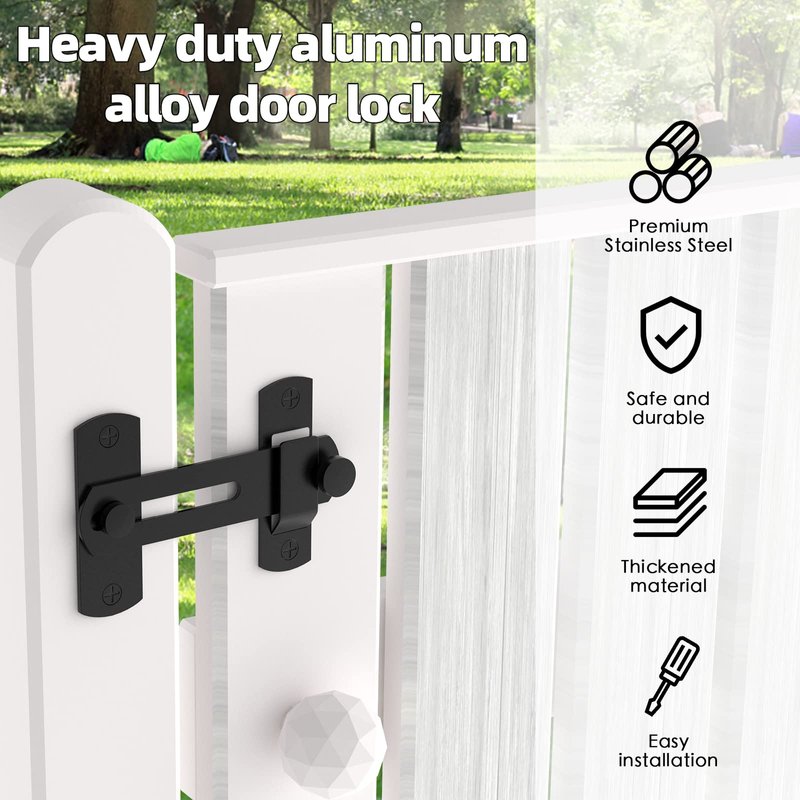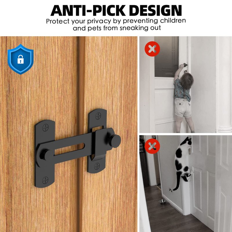 These barn door latches are perfect for single sliding barn doors and are mainly used inside rooms like bathrooms or bedrooms. There's no need to worry about whether this barn lock will fit on a sliding door left or right, as it's designed to work in both directions. High quality black slide lock are made of stainless steel with multiple layers of polishing to eliminate any corrosion, rust and discoloration, ensuring durability and reliability Sliding door lock allows quick locking or unlocking. Add simple privacy protection to your windows and doors instantly and make them childproof. Sliding barn door lock small and simple, but holds your door securely. The package comes with 4 screws and 4 plastic anchors