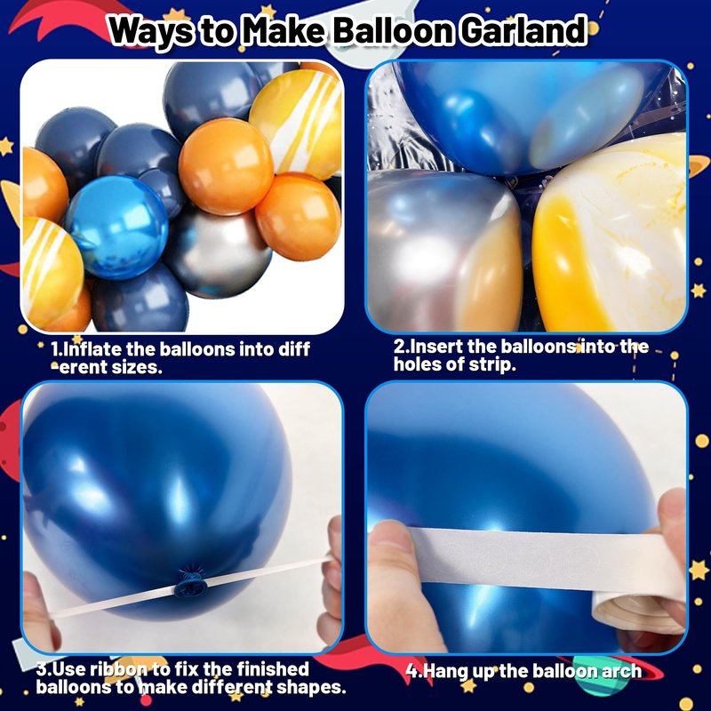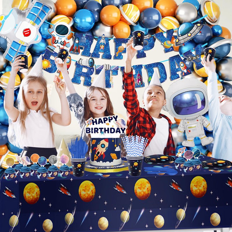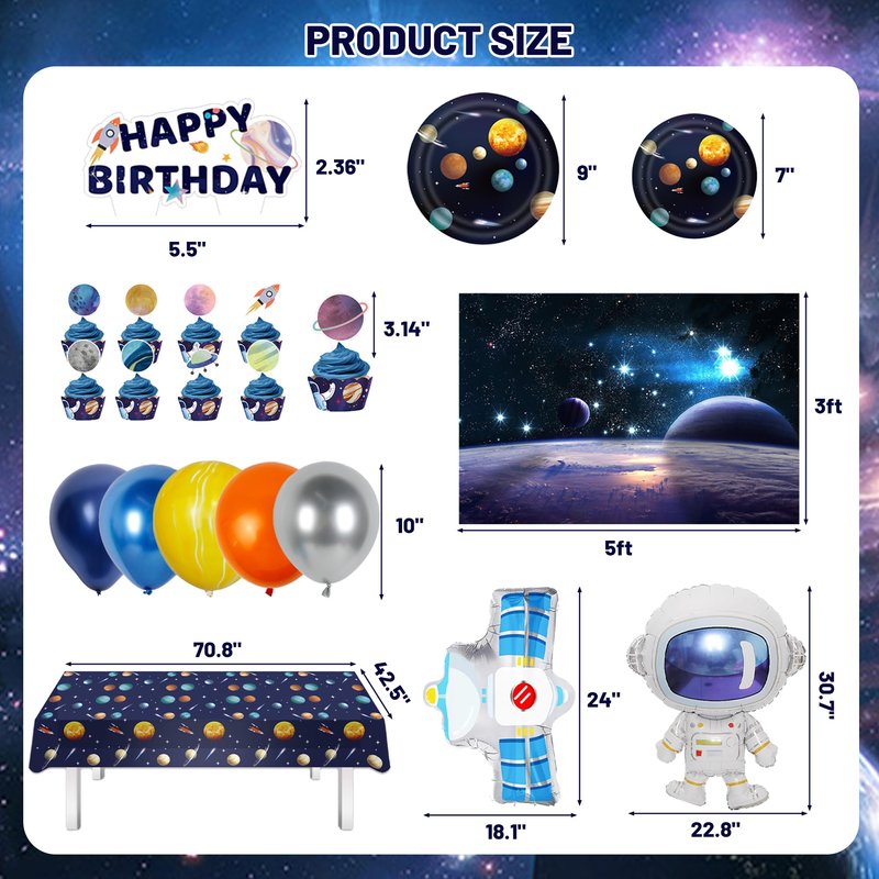 - [What You Can Get]: 1xBackdrop, 1xTablecloth, 1xAstronaut foil balloon, 1xSpace satellite foil balloon, 47xLatex balloons, 1xCake topper, 24xCupcake toppers, 10xKnives、Forks、Spoons, Cup, 20xPlates(9in/7in), 20xNapkins, 25xStraws.
