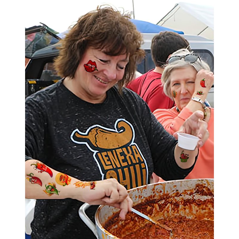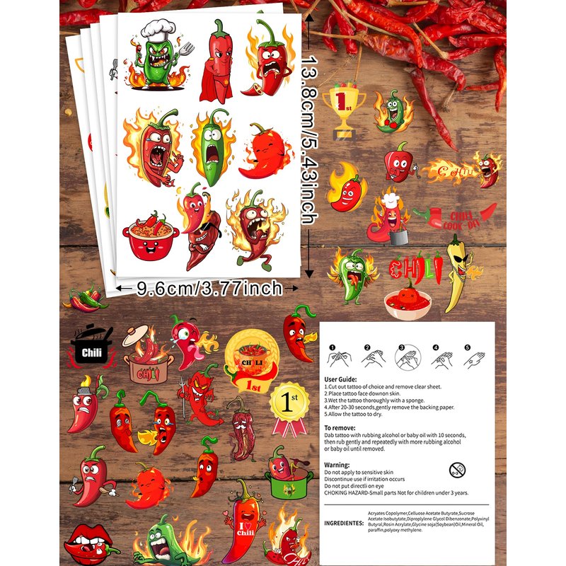 - Chili Cook Off party decorations Package includes 184 pieces of Chili themed temporary tattoos, which can be used wherever you want, such as arms, face, and hands