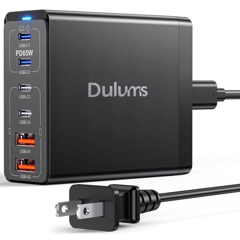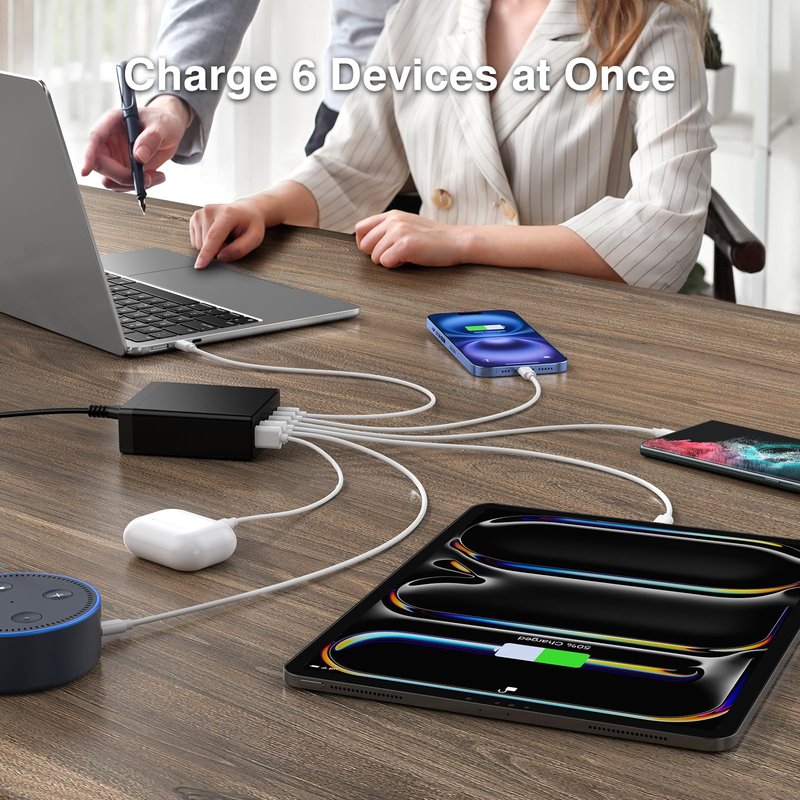 - 6 in 1 USB C Power Station :This multi-port charging hub is equipped with 2 x PD 65W USB-C ports,2 x PD 20W USB-C port and 2 x 18W QC 3.0 USB-A ports.The PD 65W ports is capable of charging one laptop. Directly power multiple electronic devices with just one wall outlet. It can reduce the burden of your accessories and help you create an organized and tidy desktop