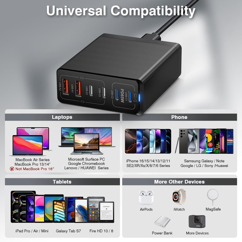 - Universal Compatible Charging Block: This multi-device charging station has 65W Maximum Output Power for macbook Pro 13''/15''/16"/Macbook 13''/ Macbook 12, able to charge a laptop such as a Macbook Pro Air, Other Ports Suitable for iPhone 16 15 14 13 12 11 Pro Max Plus Mini; Samsung Galaxy S23 Ultra S22 S21 Note 20; iPad Pro Air Mini; AirPods 4, Apple Watch 10/Ultra 2, Galaxy Tab S8 S7 S6 Tab A8 A7; Google/LG/Huawei/XiaoMi/Switch/Gamepad