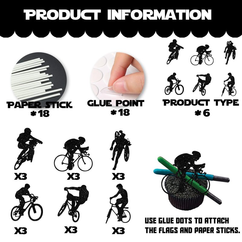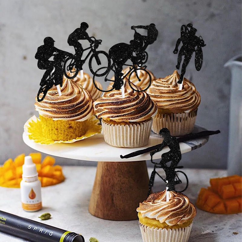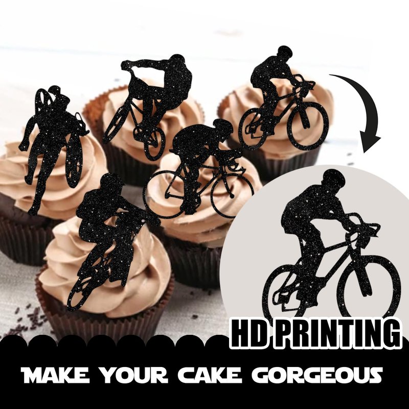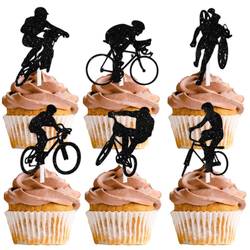 18pcs Black Glitter Bicycle Bike Dessert Cupcake Topper Biking Mountain Sport Theme Decor Supplies Baby Shower Boys Girls Man Family Party Decorations