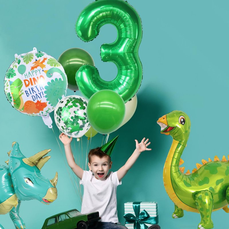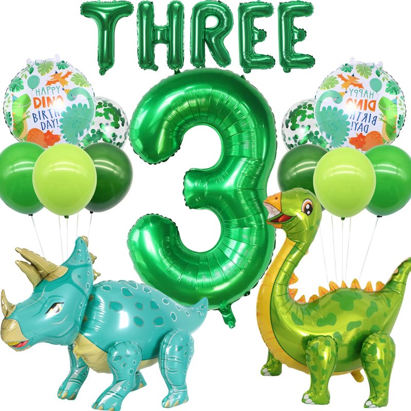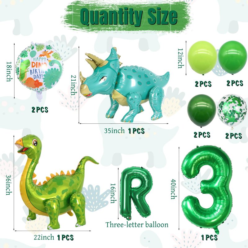 - 【Package Include】1pcs Triceratops balloon size 35 x 21 inch, 1pcs Brachiosaurus balloon size 29.5 x 25.1 inch, 2pcs 18inch roundness balloon, 8pcs 12inch Latex balloon, 1pcs 40inch Digital balloon, 5pcs 16inch Letter balloon.