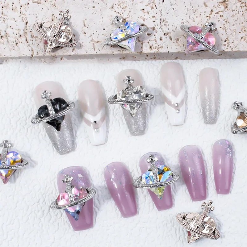 18Pcs Shiny Heart Nail Charms Planet Nail Art Rhinestone with Heart Design Crystal Nail Jewelry Silver Nail Art Charms for Acrylic Nails Heart Shape Nail Gems for Women DIY Manicure Accessories