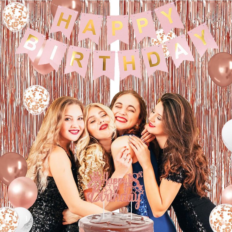 18TH BIRTHDAY DECORATIONS SET: 1 x 18th birthday crown, 1 x rose gold 18th sash, 1 x happy 18th birthday cake topper, 1 x rose gold 18 number balloon (40 inch), 1 x happy birthday banner, 2 x rose gold fringe curtain (3.2 X 8.2ft), 1 x inflating straw, 1 x balloon glue dot (100pcs dots in total), 1 x balloon ribbons (33ft in total), 1 x gold pin. You will organize the perfect happy 18th birthday party. You will organize the perfect happy 50th birthday party.