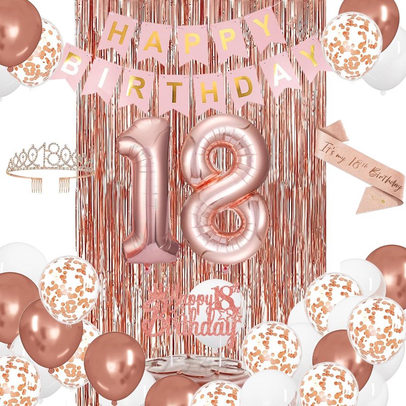 - 18TH BIRTHDAY DECORATIONS SET: This set includes a 18th birthday sash, 18th tiara/crown, "Happy Birthday" banner, 40-inch "18" number balloons, a "Happy 18th Birthday" cake topper, 2 rose gold tassel curtains (3.2 X 8.2ft), 20 rose gold latex balloons, 10 white latex balloons, 10 rose gold metallic balloons, 10 rose gold confetti balloons (12 inch), 100 balloon glue dots, 1 balloon ribbons and 1 straw. These birthday party supplies are more than enough to meet your various decoration needs.