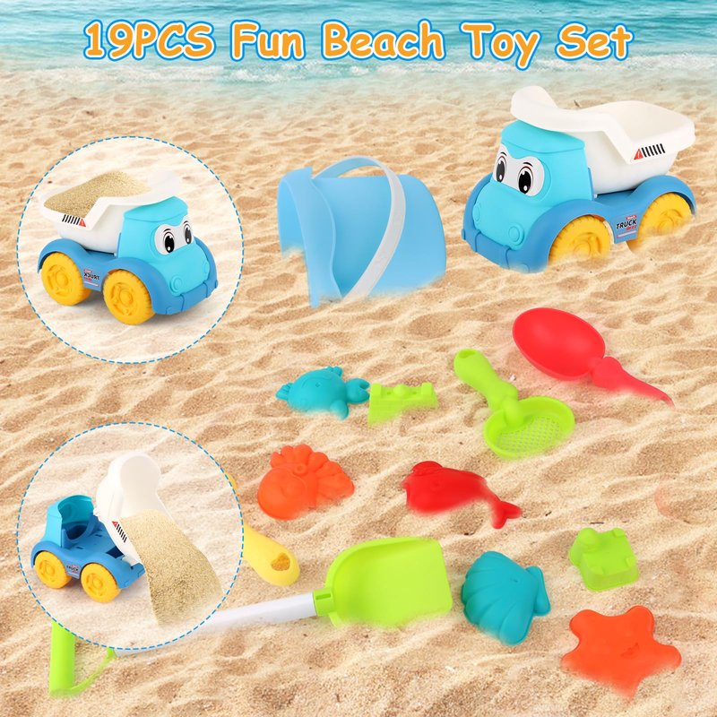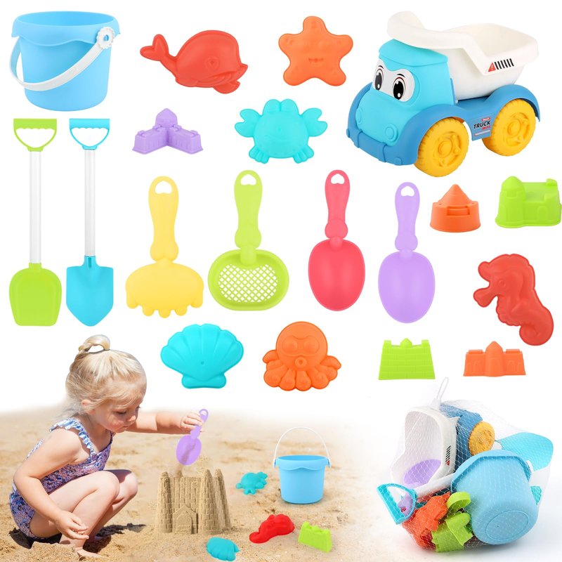 - 【19 Piece Beach Toys Set】This beach toy set contains 19 different accessories, including 1 beach cart, 1 beach bucket, 2 large shovels, 4 small shovels, 1 mesh beach bag, 5 sand castle shapes and 6 sea animal shapes. This sandbox has all the right tools for little ones, so get your child ready for fun at the beach!