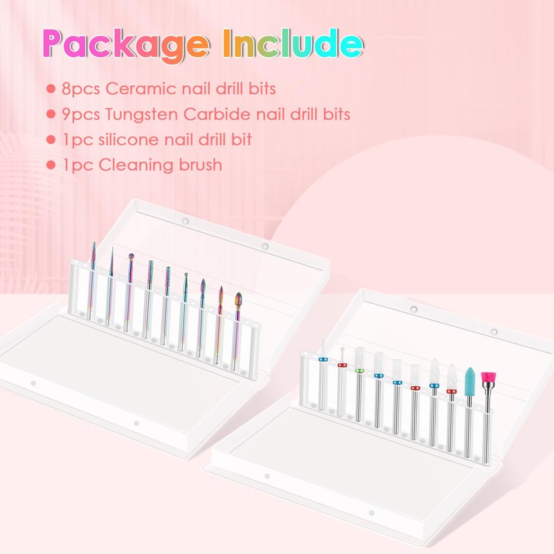 - 19-Piece Nail Drill Bit Set: Our nail drill bits kit comes with 8pcs ceramic bits, 9pcs tungsten carbide bits, 1pcs silicone bit & 1pcs cleaning brush, all in one set for manicure and pedicure, ideal for both beginners and professionals.