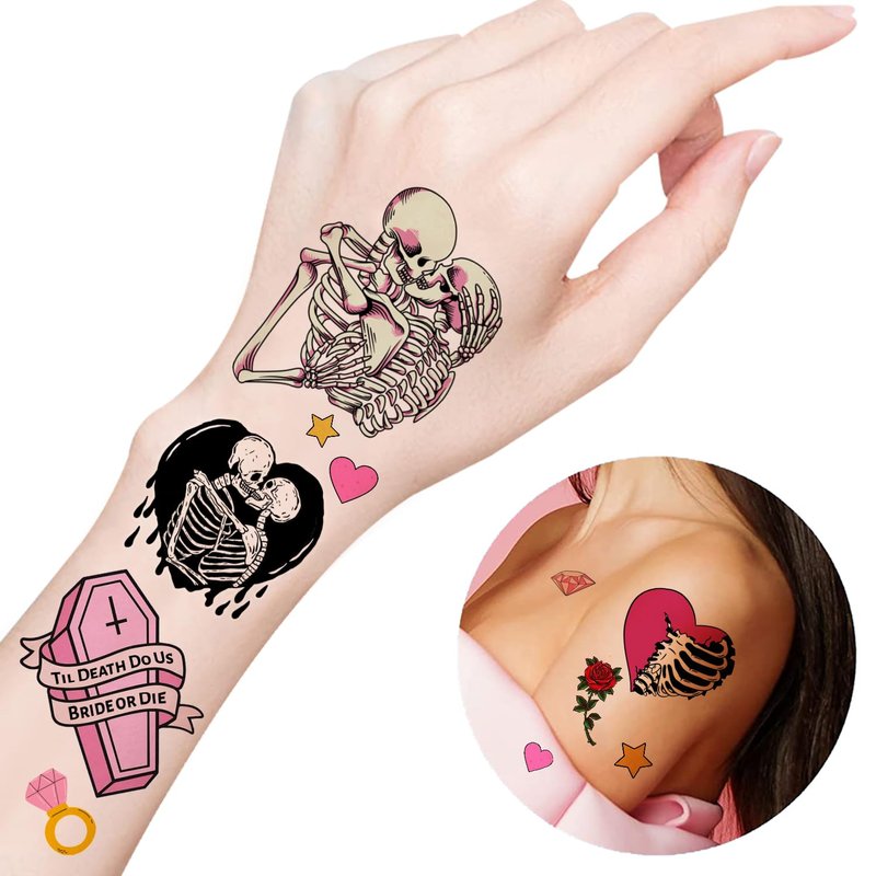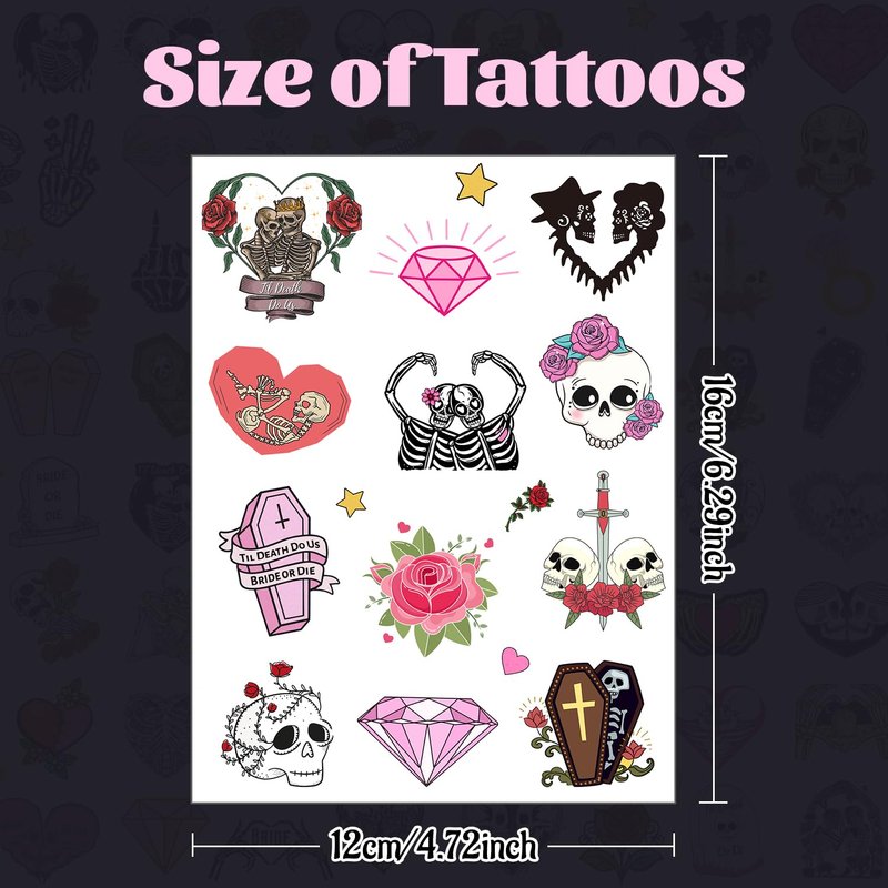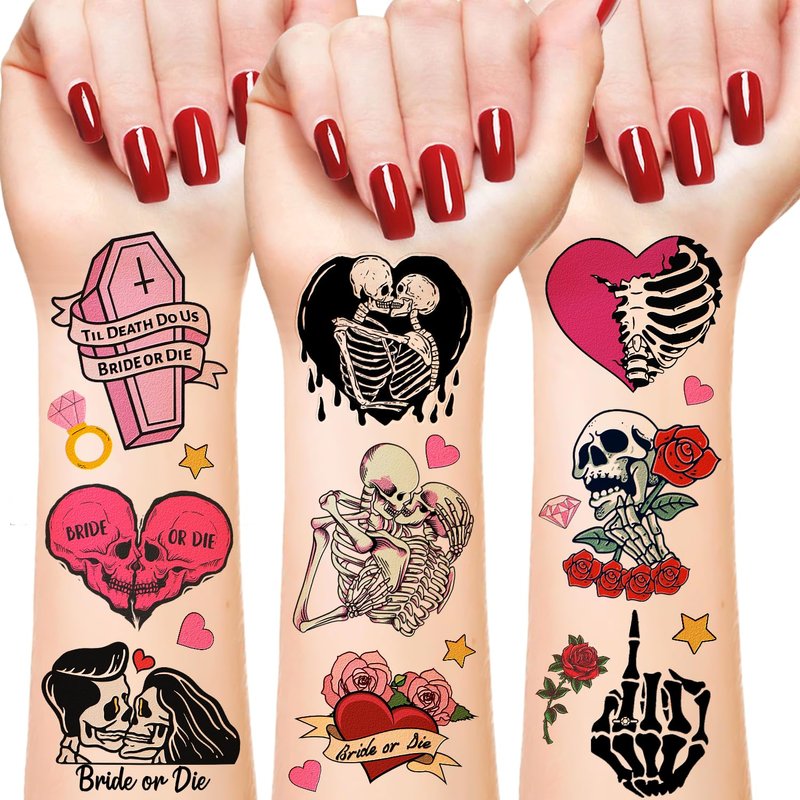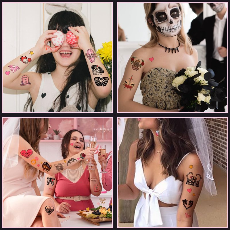 - 【Till Death Do Us Party Temporary Tattoos】Romantic and cool tattoos play at the bridal shower party supplies, 8 sheets X 2 same patterns of each sheet, a total of 16 sheet and 192pcs patterns! Different kinds of tattoos are the essential accessory to complete your bride spooky bachelorette party look, which is ideal for Halloween parties.